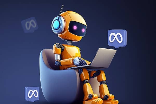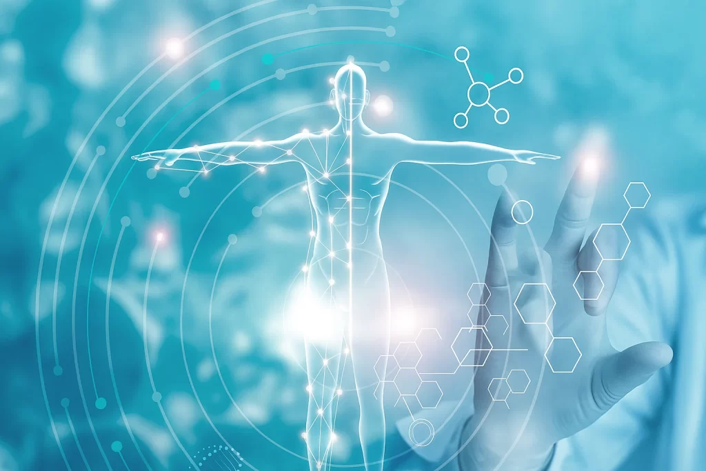 A robotic hand reaching into a digital network on a blue background, symbolizing AI technology.